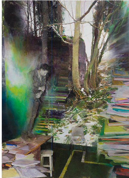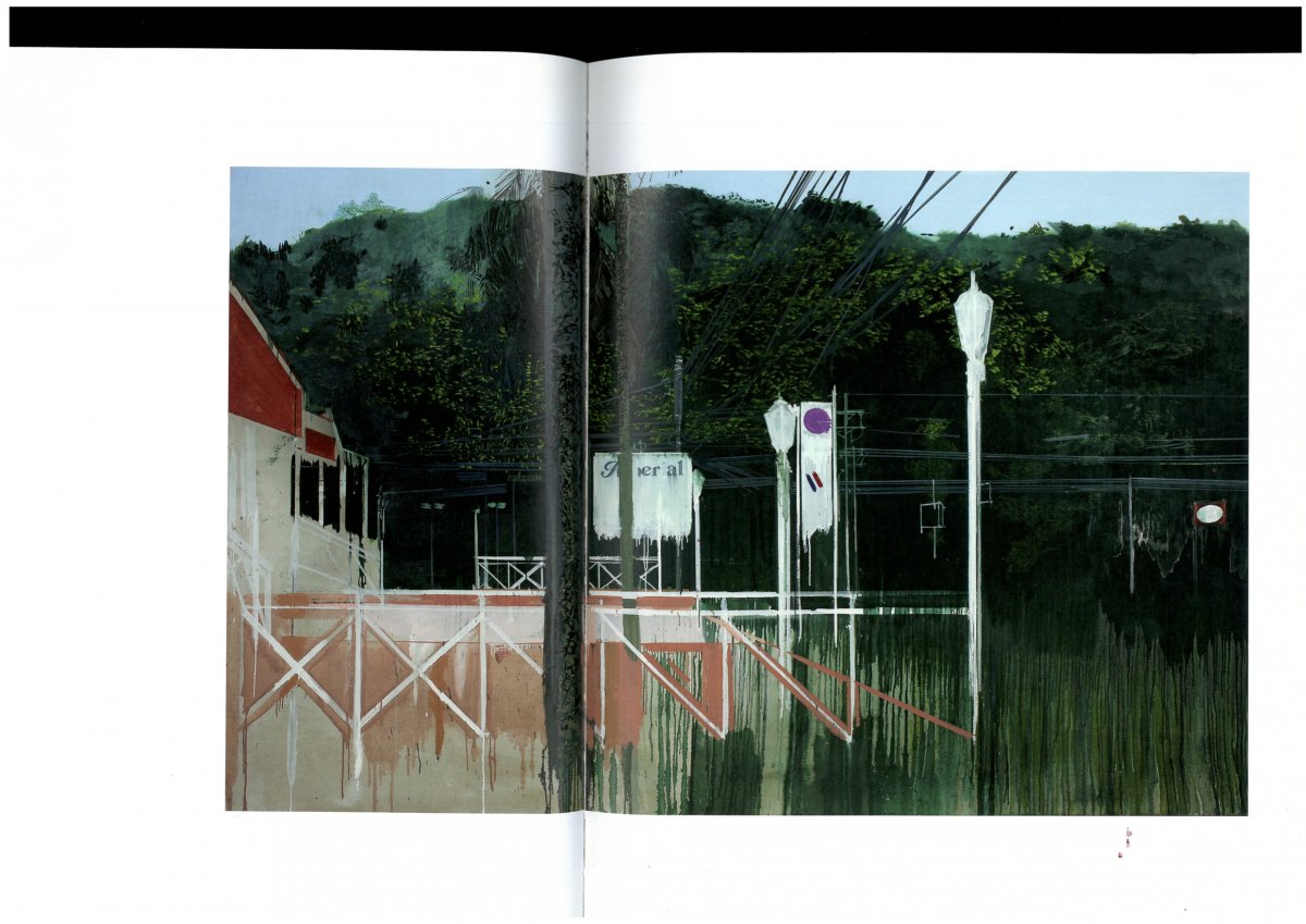 JM: I have always enjoyed color: I stripped it out and now I am coming back to it and it is a joy, I have to admit. I have to do it in a clever way if possible. I try to make the colors slightly wrong: toxic and altered. I’m not into painting a blue sky. If one of my skies is blue it is because it has been stained by smoke bombs and sodium lighting. If it’s a sunny sky I’ll put a lot more yellow into it: I’ll make it sulfurous, hence the turquoises. It’s all wrong. It’s not the bucolic view you are expecting.