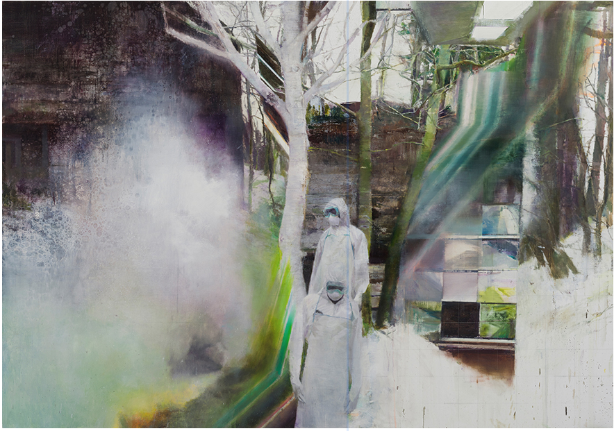 So you have this incongruity: the Ebola people, coming to your doorstep, which I suppose is a theme I have explored a lot. There is a knock on the door, the SS taking someone out, the Serbian militiaman coming down your village street and pulling out the Muslims. It’s that kind of horror, but I’m also trying to present very coloristic, beautiful painting. The painting in this show is the most formal in terms of its elements. The paintings are quite cinematic and you know where you are in the space. In other paintings things are more difficult and more opaque.
